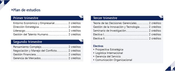» Formar individuos capaces de desarrollar y liderar procesos de planeación, ejecución y control gerencial, a través del conocimiento de herramientas orientadas al diseño de escenarios para que las estrategias sean efectivas en el desempeño organizacional, considerando la incertidumbre como parte del proceso.