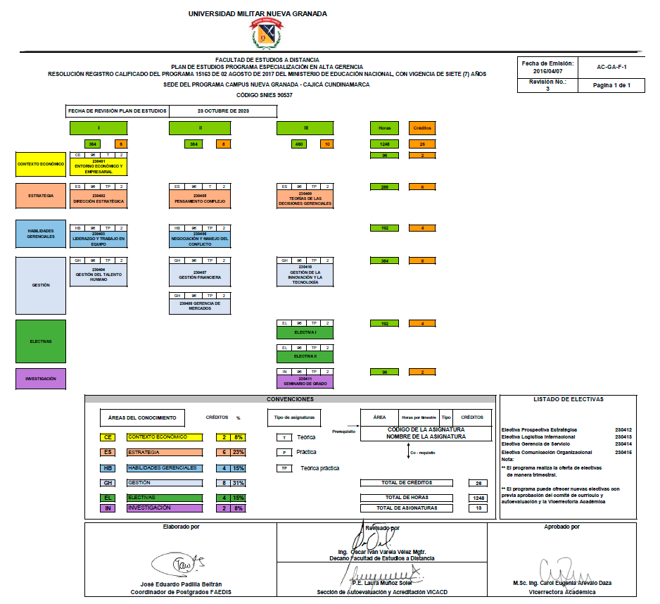 SNIES: 90537 - Resolución: 10262 del 25 de junio de 2024 por la cual se resuelve: Renovar el registro calificado por el término de siete (7) años, y aprobar las modificaciones al siguiente programa: Institución: Universidad Militar Nueva Granada Denominación: Especialización en Alta Gerencia Título a otorgar: Especialista en Alta Gerencia Lugar de desarrollo: Cajicá (Cundinamarca). Modalidad: A distancia Créditos académicos: 26